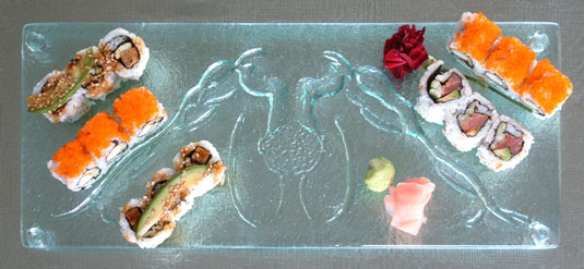 This is one of the latest designs; this Tray created from Clear 3/8 inch thick glass but could be done in 1/4 inch thick Clear or Gray glass. Photographed on silver background Please let me know if you like it
