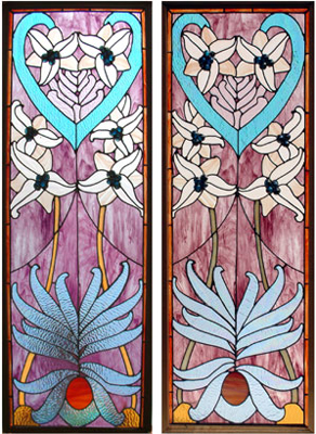 Title - Classical Art Nouveau Floral Design Medium -Leaded/Stained Glass, Rippled iridescent glass and "water" glass. Dimensions - 46" x 17"